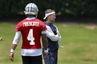 Dallas Cowboys quarterback Dak Prescott (4) walks up the field as head coach Brian Schottenheimer, right, looks during NFL football practice, Thursday, May 29, 2025, in Frisco, Texas. (AP Photo/Jerome Miron)