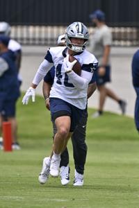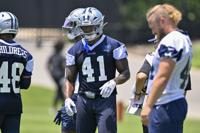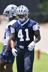 Dallas Cowboys defensive end Donovan Ezeiruaku (41) looks on during NFL football practice, Thursday, May 29, 2025, in Frisco, Texas. (AP Photo/Jerome Miron)
