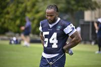 Dallas Cowboys linebacker DeMarvion Overshown looks on from the sidelines during NFL football practice, Thursday, May 29, 2025, in Frisco, Texas. (AP Photo/Jerome Miron)