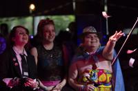 From left, June Arney and Caspian Brooks watch as Ambrose throws faux money on stage as a drag king performs during a "Pink Pony Prom" held to celebrate teen and young adult members of the LGBTQ+ community on Friday, May 30, 2025, in Portland, Ore. (AP Photo/Jenny Kane)