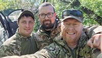 Nick Maimer, right with two of the civilians-turned-infantrymen he helped train for battle in Ukraine.
